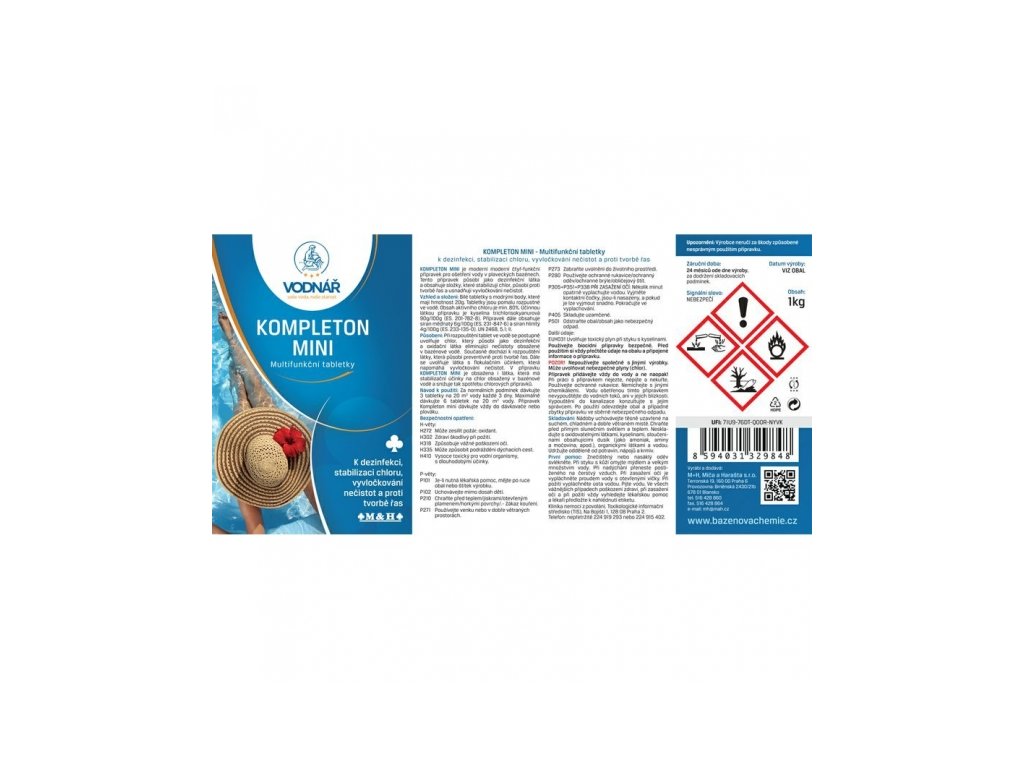 Kompleton mini je 4-funkční dezinfekce pro kompletní péči o malé bazény ve formě 20g tabletek. Obsahuje složky pro dezinfekci, stabilizaci chloru, vločkování a proti tvorbě řas. Jedná se o bílé tabletky s modrými body, které mají hmotnost 20g. Tabletky jsou pomalu rozpustné ve vodě. Obsah aktivního chloru je min. 80%. Účinnou látkou přípravku je kyselina trichlorisokyanurová. Dále přípravek obsahuje síran měďnatý a hlinitý. Při rozpouštění tabletek ve vodě se postupně uvolňuje chlor, který působí jako dezinfekční a oxidační látka eliminující nečistoty obsažené v bazénové vodě. Současně dochází k rozpouštění látky, která působí proti tvorbě řas.