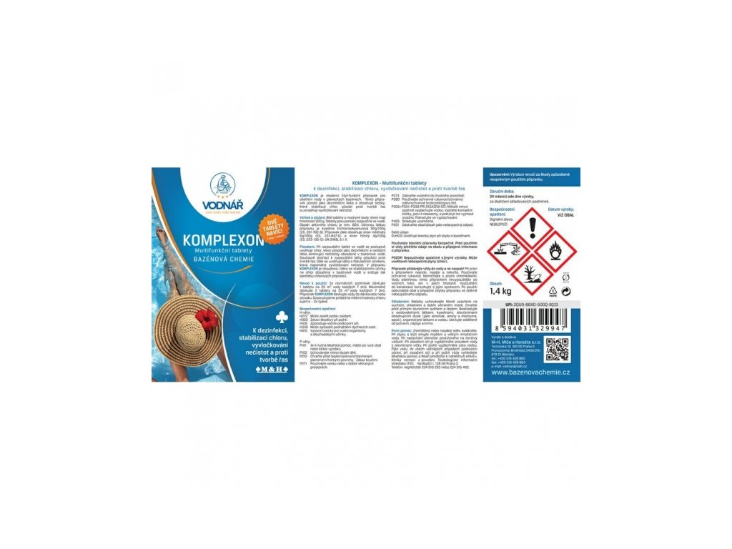 Komplexon je moderní multifunkční přípravek pro ošetření vody. Tento přípravek působí jako dezinfekční látka a obsahuje složky, které stabilizují chlor, působí proti tvorbě řas a usnadňují vyvločkování nečistot. Obsah aktivního chloru je 80%.