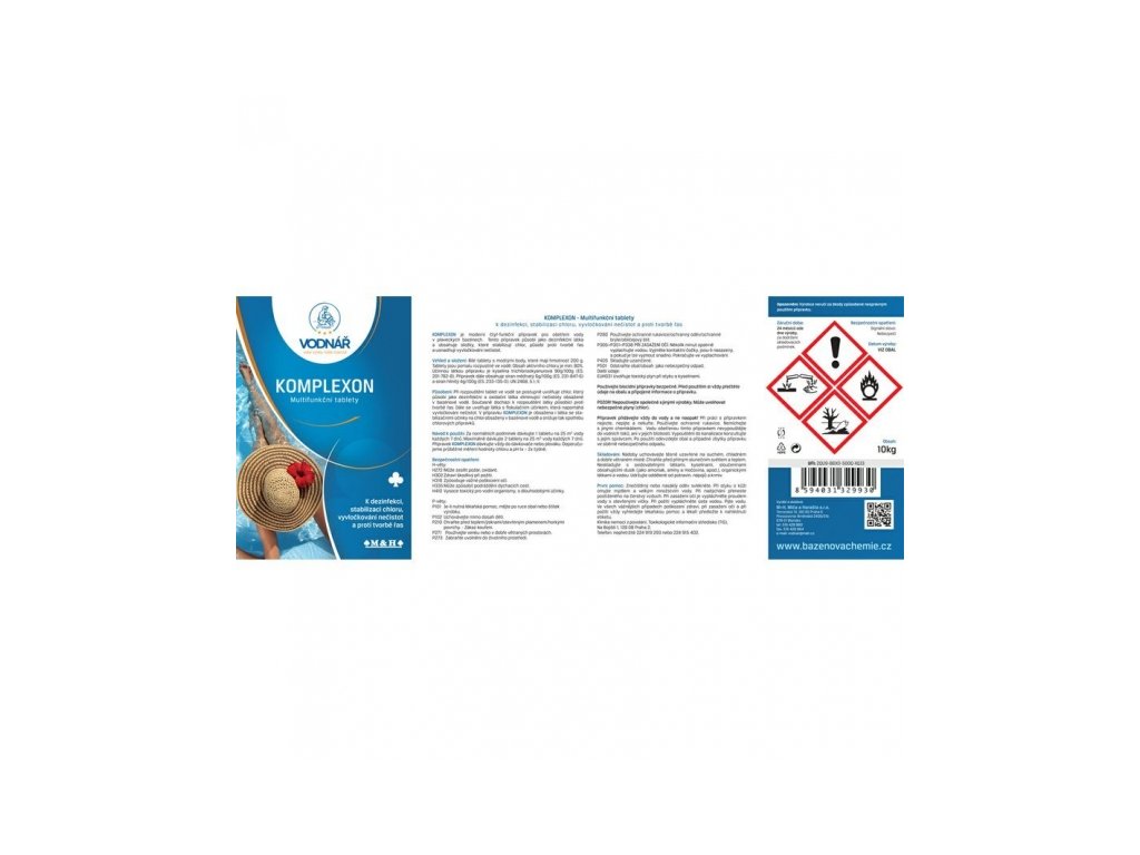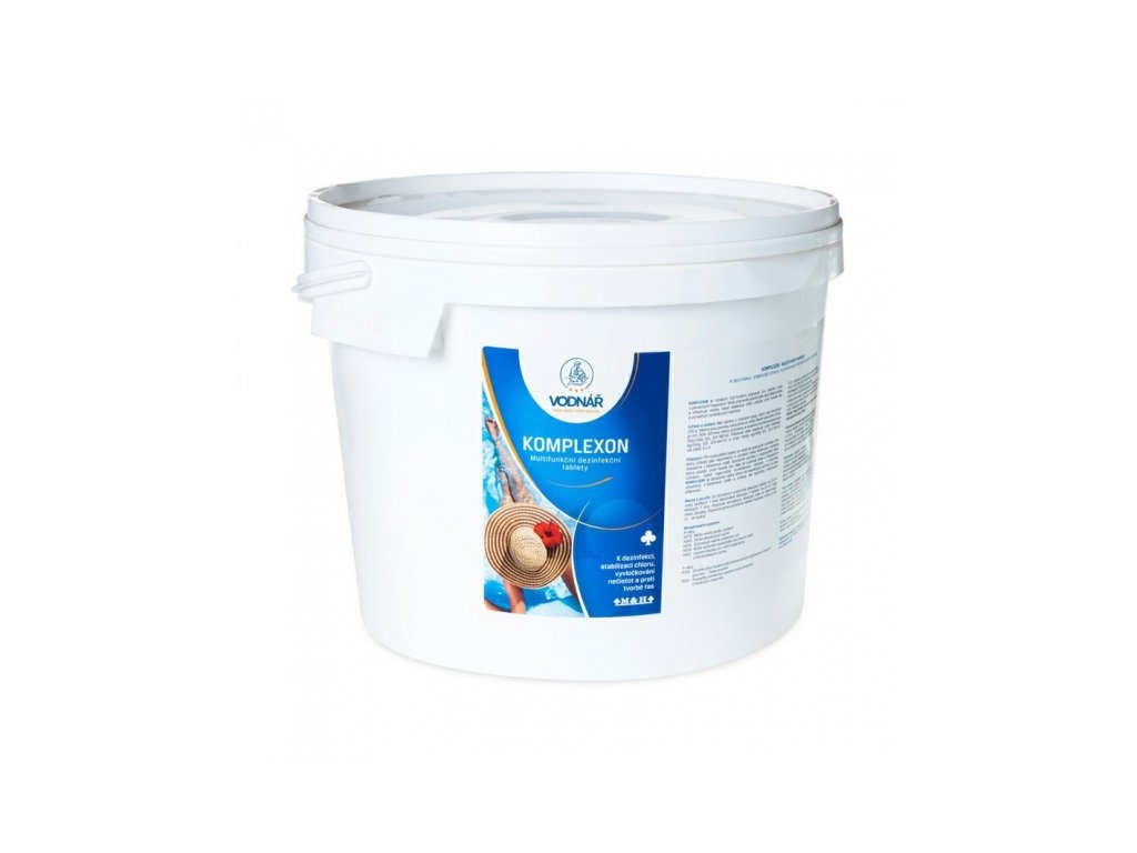 Komplexon je moderní čtyřfunkční přípravek pro ošetření vody. Tento přípravek působí jako dezinfekční látka a obsahuje složky, které stabilizují chlor, působí proti tvorbě řas a usnadňují vyvločkování nečistot. Obsah aktivního chloru je 80%.