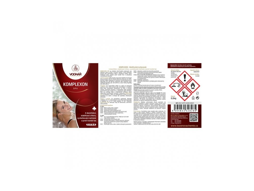 Komplexon SPA je moderní čtyřfunkční přípravek pro ošetření vody ve SPA a vířivých vanách. Tento přípravek působí jako desinfekční látka a obsahuje složky, které stabilizují chlor, působí proti tvorbě řas a usnadňují vyvločkování nečistot.