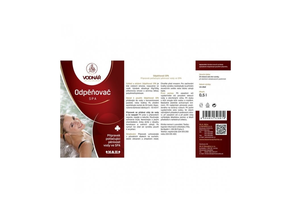 Odpěňovač SPA je bílá viskózní emulze, rozpustná ve vodě. Výrobek obsahuje 10g/100g silikonovou emulzi s účinnou látkou polydimethylsiloxan.
